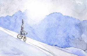 Sur chacune de ses aquarelles,des personnages acrobates évoluent gracieusement au gré des cimes.