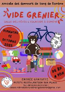 L'amicale des donneurs de sang organise un vide-greniers dans la salle des fêtes de Domène, l'Ecapade, ce dimanche 12 octobre, de 08h00 à 16h00.